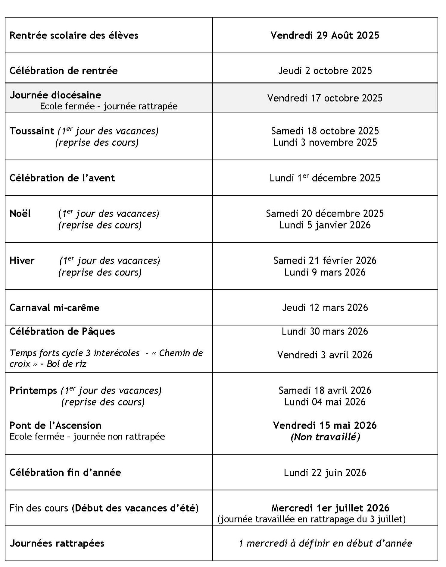Calendrier 2025/2026